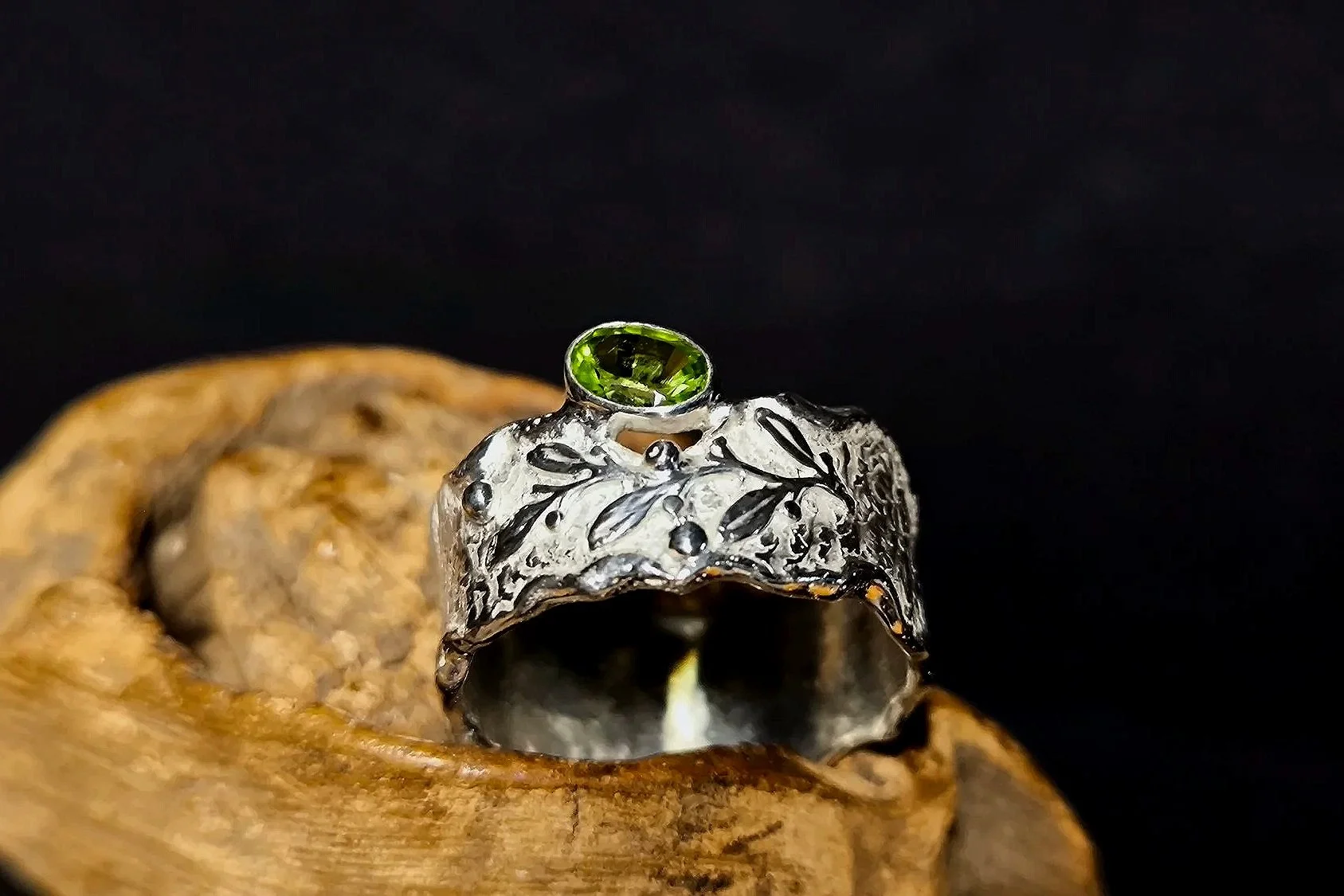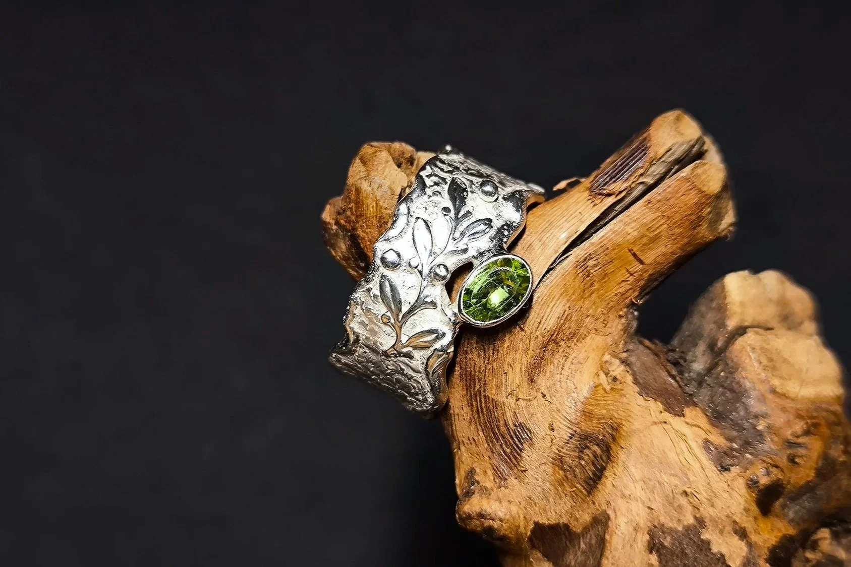 Silberring mit feiner Struktur. Darauf zarte Blätter gearbeitet, welche einen funkelnden Rhodolithen (4,5 mm) einrahmen. Ein schöner Ring, der sich zu jedem Anlass tragen lässt!